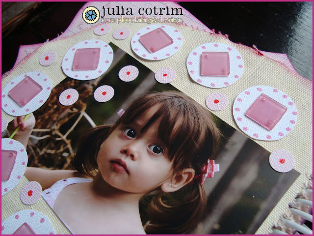 página 13: outro pedaço de canvas cru, dessa vez cortado de forma arredondada. usei o furador que gosto tanto no alto da foto. por trás dessa foto colei um pedacinho de tecido, também cortado de forma arredondada. enfeitei com chipboards coloridos, botões e linhas de bordar brancas. também colori pequenas bolinhas no canvas com caneta rosa.