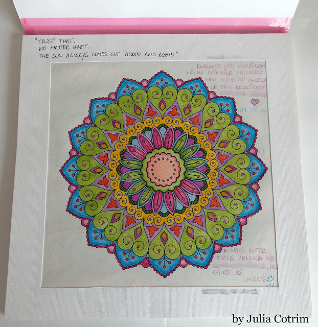 no vídeo, a mandala da capa não tinha sido colorida e nem tinham sido coladas as mandalas no interior do álbum. resolvi então tirar fotos para mostrar como tudo ficou!